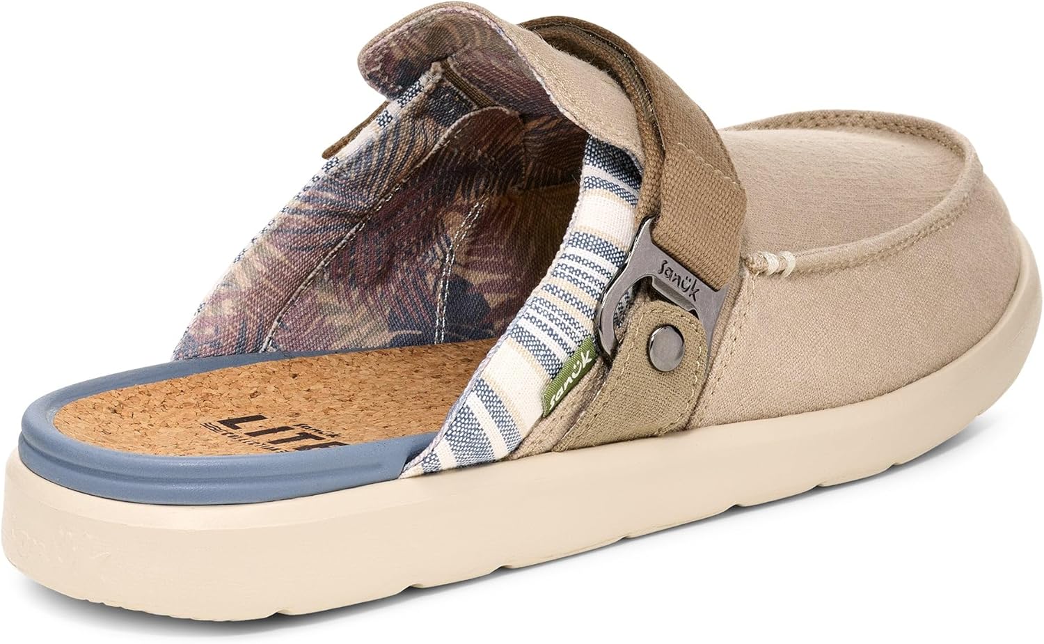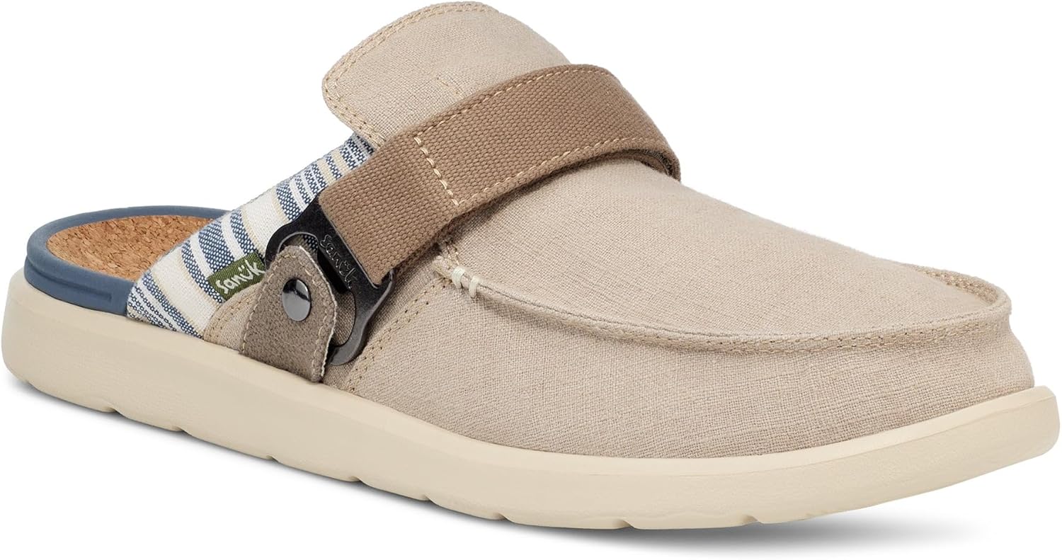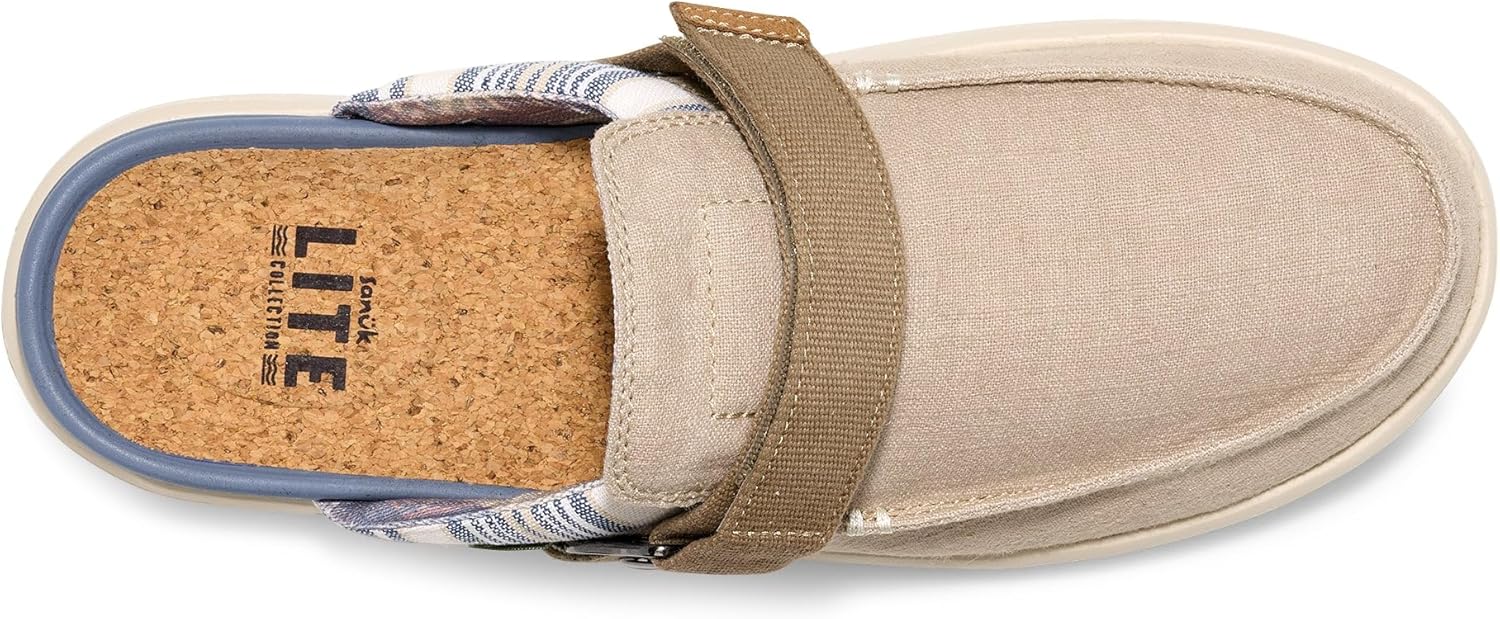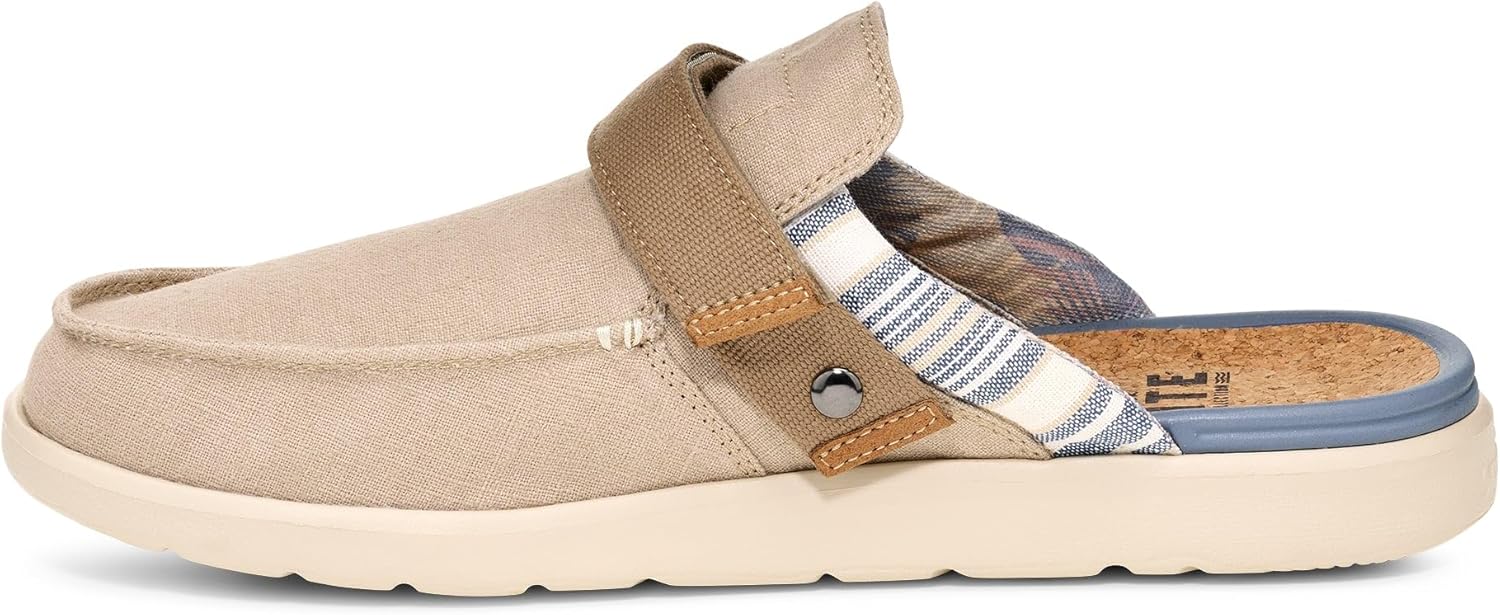 A relaxed fit mule upper made from a soft linen and topically applied with a water repellency treatment. Adjustable cotton webbing closure strap featuring a removable custom bottle opener. All cotton used is responsibly sourced.