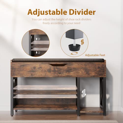 【Large Storage Entryway Bench】2-tier shoe rack bench could store 8 pairs of shoes maximum.The middle partition is adjustable, and there is also a larger compartment for storing boots.Hollow shoe rack design is very easy to clean.