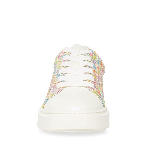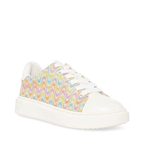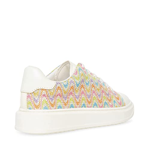 Clean and fresh, the Steve Madden CHARLY kids’ lowtop sneaker is set on a flat platform sole. This style features a synthetic footbed, a colored back pull tab and classic, round toe silhouette.