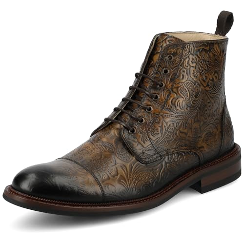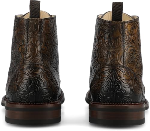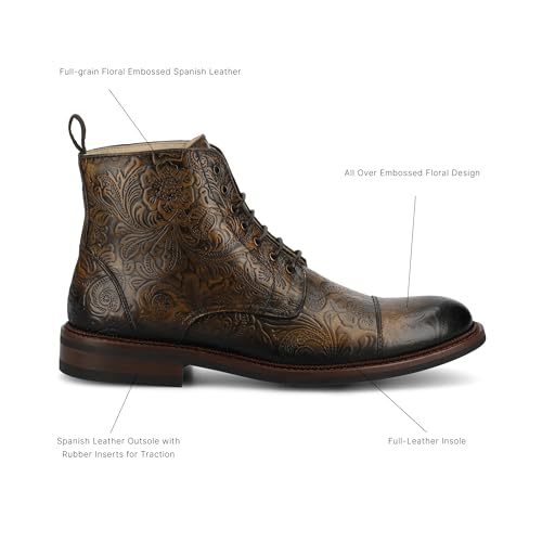 Our Rome Boot in Oro Viejo will have you going out in style with its genuine leather, almond toe shape, floral pattern, and leather outer sole. Their lace-up closure details and cushioned footbed will give you that professional look to go from work to any formal event or even a nice dinner while still leaving your feet feeling more comfortable than ever.